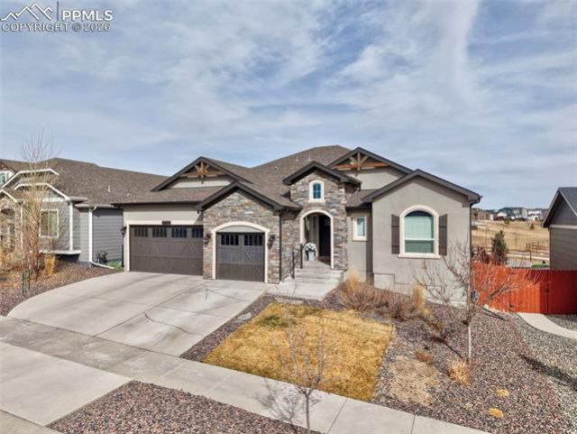 Looking for a 5 bedroom home backing to open space with no rear neighbors, a finished garden level basement, smart home upgrades, and high end finishes in the sought after Meridian Ranch community in Peyton, Colorado? This Saint Aubyn Presidential home blends Colorado inspired architecture with built in entertainment. Stucco with stone accents, 3 car garage with raised panel carriage style doors. Inside has upgraded interior featuring LVP flooring in the main living areas, rounded drywall corners, 4.5 inch baseboards, decorative arches and niches, iron spindle railing, and a stone accented fireplace with a flat wall above it ready for your mounted TV. The gourmet kitchen offers quartz slab countertops, 42 inch birch cabinets with crown molding, stainless Whirlpool appliances including a gas range, wall oven and microwave, full range hood, and oil rubbed bronze fixtures. The home also features a formal dining space that can easily be used as an office or flex room. The primary suite offers large windows for natural light and a spacious ensuite bath with dual sinks, soaking tub, stand up shower, and beautiful tile finishes. Throughout the home you will find recessed lighting, custom paint accents, and vaulted ceilings that enhance the open feel. The basement brings in abundant natural light and features a large entertainment space with built in surround sound plus additional hard wired speakers throughout the home including the wet bar, kitchen, primary bedroom, and covered patio, all controlled through the Nuvo app. Enjoy Colorado outdoor living and entertaining on the 26 x 12 covered patio deck with built in speakers, a gas line for BBQ, and a putting green while backing to open space on a large lot. Extras include electrical blinds in the upper living room windows, hard wired Ring floodlight security cameras, double pane Low E vinyl windows, a 93 percent efficient gas furnace, central air conditioning, humidifier, 50 gallon hot water heater, and a drywalled garage.